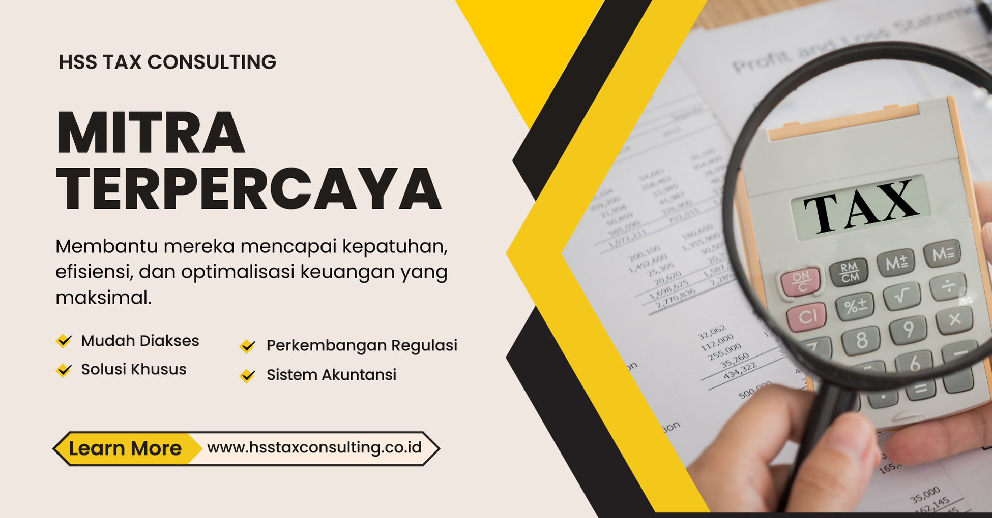 Selamat datang di HSS Tax Consulting, penyedia jasa konsultasi perpajakan yang berdedikasi untuk membantu klien kami, memahami dan mengelola kewajiban pajak mereka dengan mudah, akurat, dan sesuai dengan peraturan yang berlaku. Kami berdedikasi untuk memberikan solusi perpajakan yang profesional dan menyeluruh, membantu Anda dalam setiap langkah, dari perencanaan hingga pelaporan pajak.
